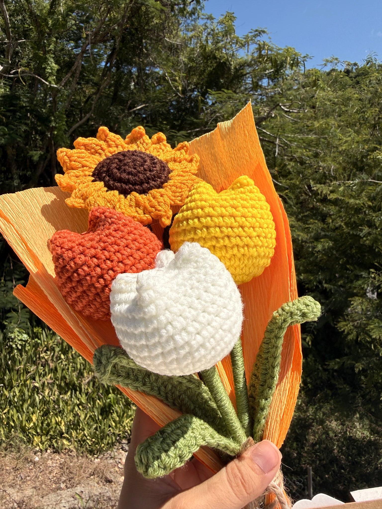 Bouquet de flores tejidas a mano. Incluye tres tulipanes y un girasol con sus papeles decorativos.